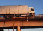 Caminhão baú fica pendurado em mureta de viaduto na BR-365, em Patrocínio