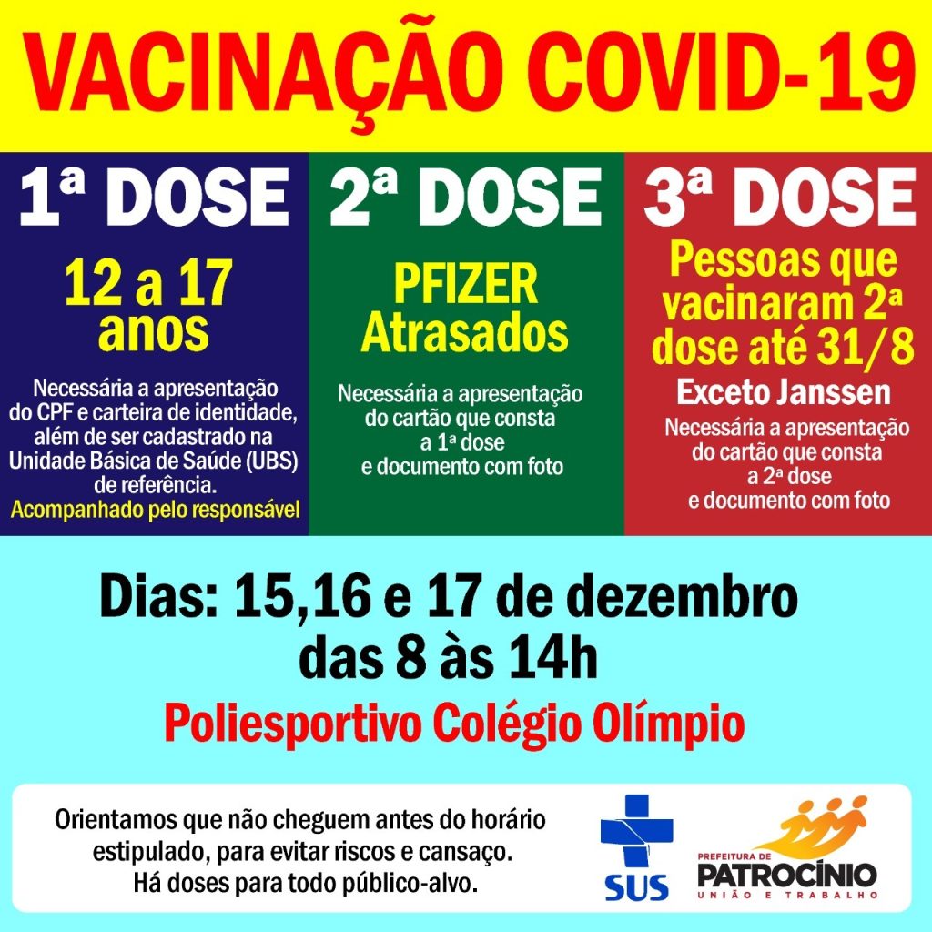 Nos dias 15, 16, 17 de dezembro pessoas que estão com a segunda dose da Pfizer atrasada e pessoas com 12 à 17 anos que não tomaram a 1ª dose, receberão a vacina.