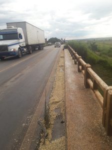 Um caminhão estava transportando soja a granel na BR-365, KM 474 , a tampa lateral veio a abrir e despejar a soja num perímetro de 500 metros, tornando a pista escorregadia e perigosa ao tráfego de veículos. Foi realizado a limpeza da pista. Tivemos apoio da PM, que realizou obstrução de meia pista.