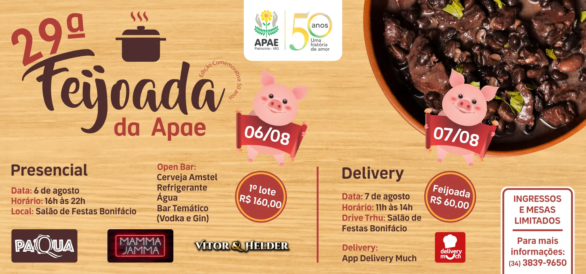29ª Feijoada da APAE estará comemorando os 50 anos da associação de Patrocínio. O evento irá acontecer de forma presencial no dia 6 de agosto e delivery no dia 7 de agosto.