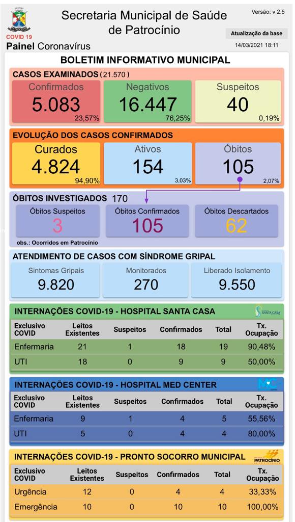 A Secretaria Municipal de Saúde de Patrocínio divulgou neste domingo (14) o novo boletim epidemiológico de coronavírus.
