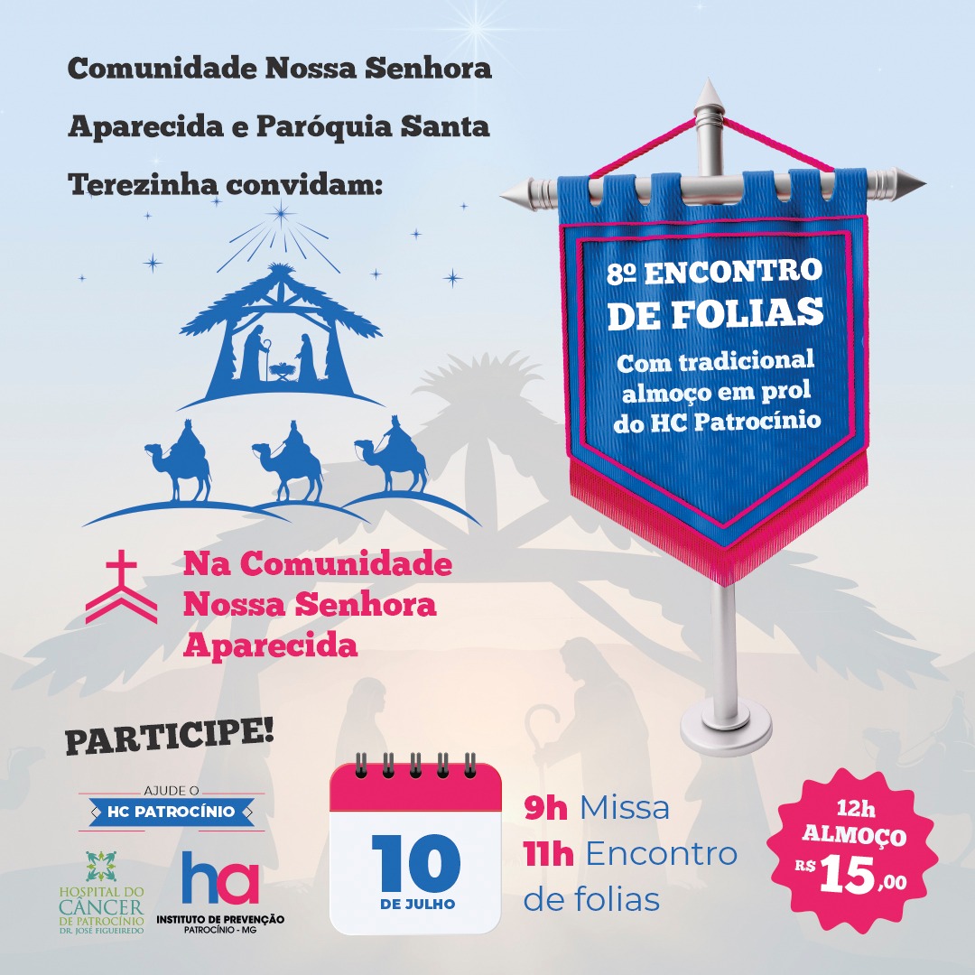 No próximo domingo (10), a Comunidade Nossa Senhora Aparecida juntamente com a Paróquia Santa Terezinha, estará realizando o 8° Encontro de Folias em prol do Hospital do Câncer de Patrocínio Dr José Figueiredo.