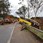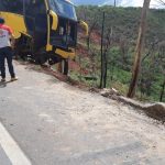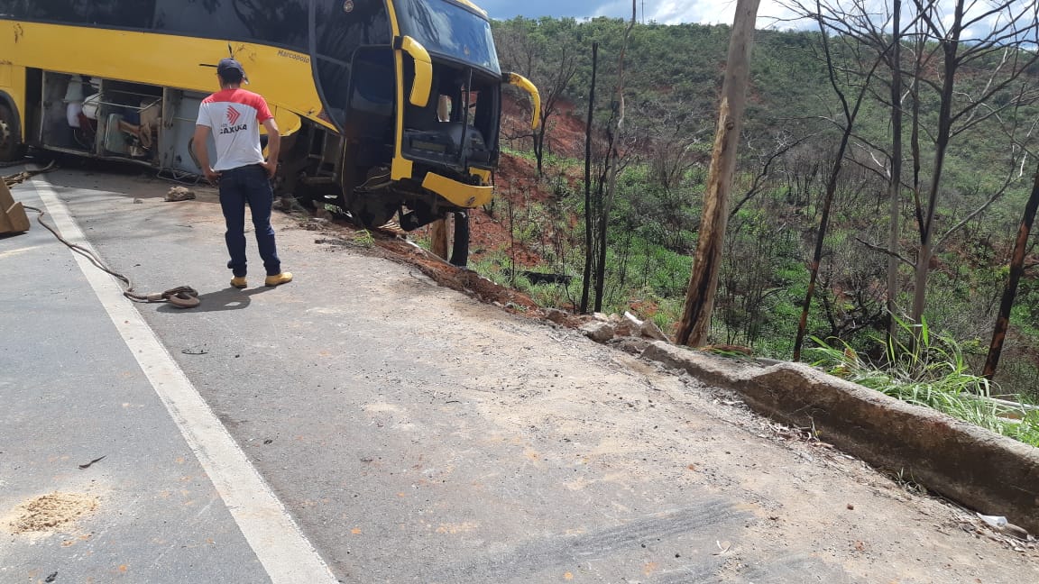 O ônibus colidiu contra um barranco de um lado da rodovia e atravessou a pista. O lado contrário é um barranco.