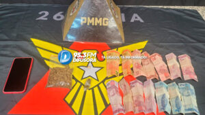 Durante Patrulhamento militares perceberam que o jovem tentou se esconder em uma guarita ao notar a aproximação da viatura, o que motivou a abordagem. Durante busca pessoal, foram encontradas com ele uma bucha de maconha, uma pedra de crack, 106 reais em moedas e um aparelho celular em mau estado de conservação.