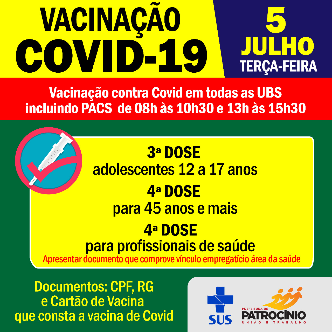 Adolescentes de 12 a 17 anos recebem a 3ª dose, pessoas acima de 45 anos e profissionais da saúde recebem a 4ª dose da vacina contra Covid-19 nesta terça-feira (05).