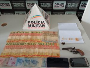Em continuidade aos trabalhos militares localizaram na sala da residência, dentro de uma caixa de papelão, uma garrucha calibre 32. além de 70 reais em dinheiro. Dois aparelhos de telefones de propriedade dos suspeitos também foram apreendidos pelo militares.
