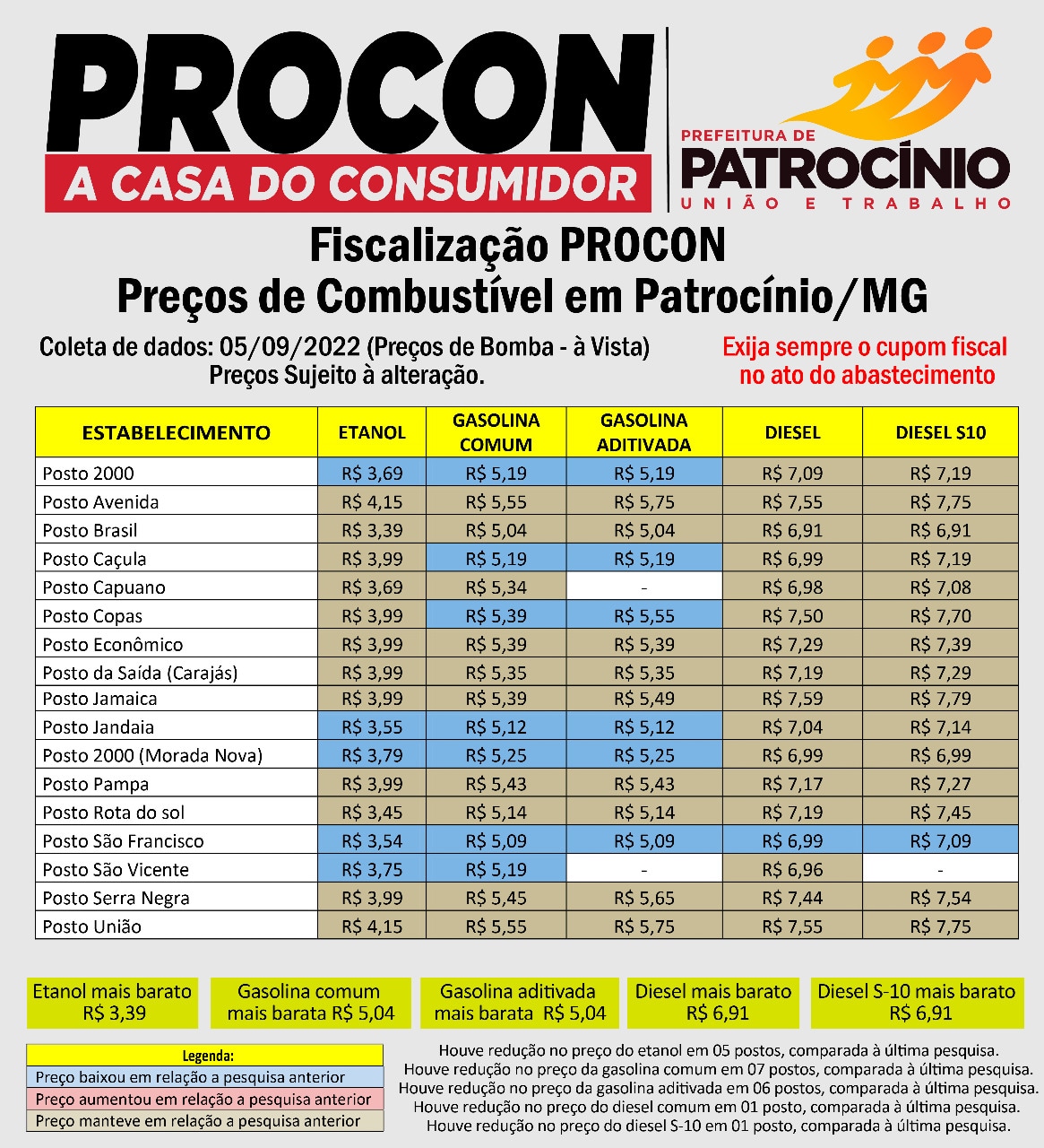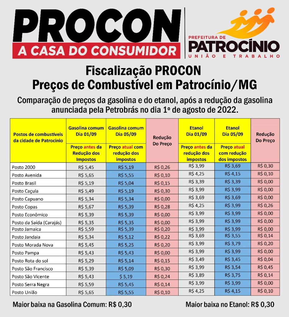 Nesta segunda-feira (05), o Procon Municipal de Patrocínio divulgou uma comparação de preços da gasolina e do etanol, após a redução do preço da gasolina anunciado pela Petrobras no dia 1° de setembro.