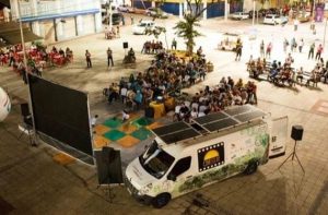 Cynthia explicou que o Cinesolar viaja pelo país em uma van equipada com uma placa fotovoltaica, ou seja, que capta energia solar enquanto viaja e equipamentos que a transforma em energia elétrica para carregar baterias que vão ser usadas nas projeções dos filmes.