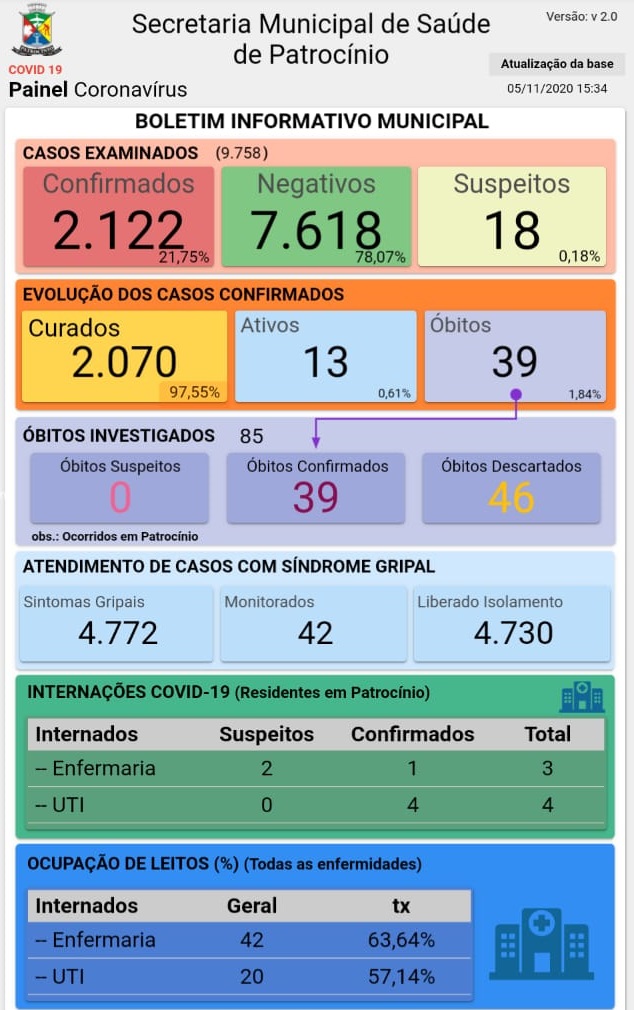 O novo boletim epidemiológico de coronavírus foi divulgado pela Secretaria Municipal de Saúde de Patrocínio na tarde desta quinta-feira (05).