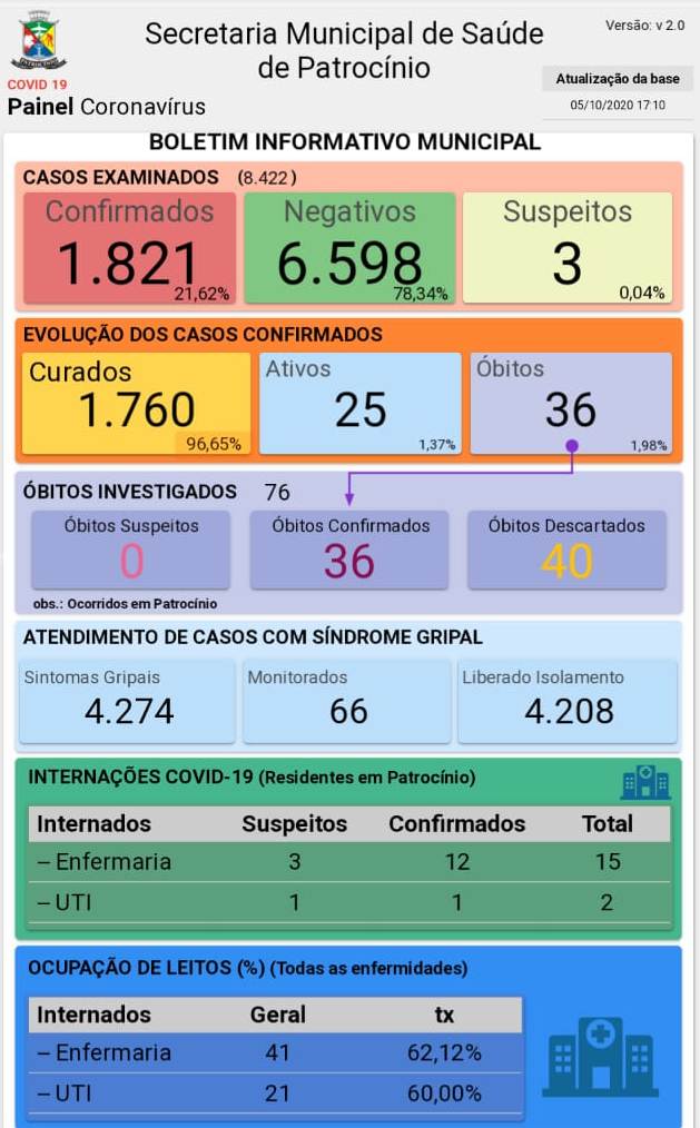 A Secretaria Municipal de Saúde de Patrocínio divulgou, na tarde desta segunda-feira (05), o novo boletim epidemiológico de coronavírus.