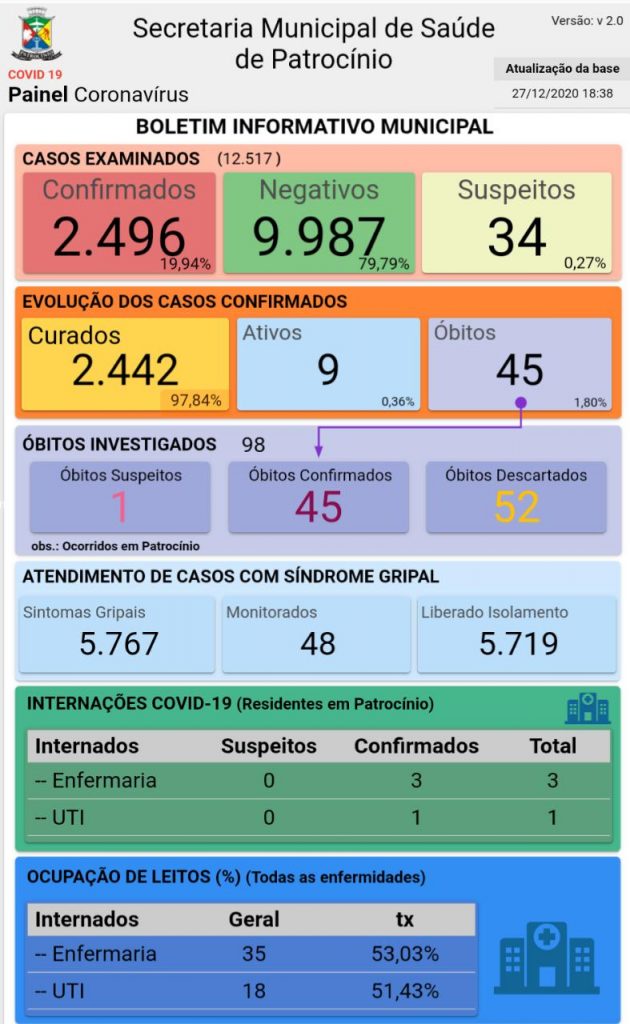 O novo boletim epidemiológico de coronavírus foi divulgado, neste domingo (27), pela Secretaria Municipal de Saúde de Patrocínio.