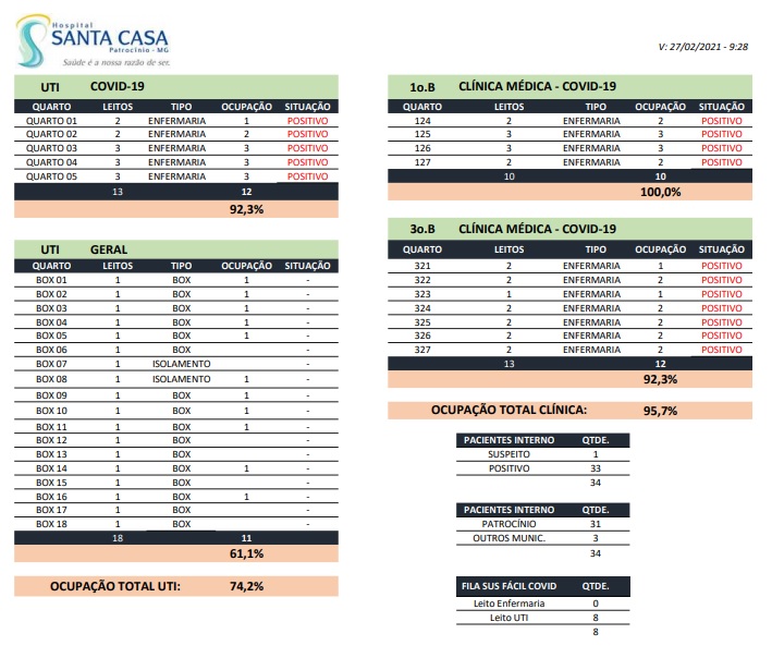 O Hospital Santa Casa de Patrocínio, divulgou na manhã desta segunda-feira (01), o boletim com dados da ocupação hospitalar da entidade.