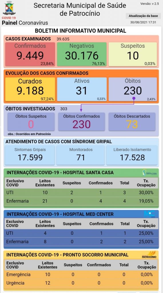 Nesta segunda-feira (30) a Secretaria Municipal de Saúde de Patrocínio divulgou o novo boletim epidemiológico de coronavírus.