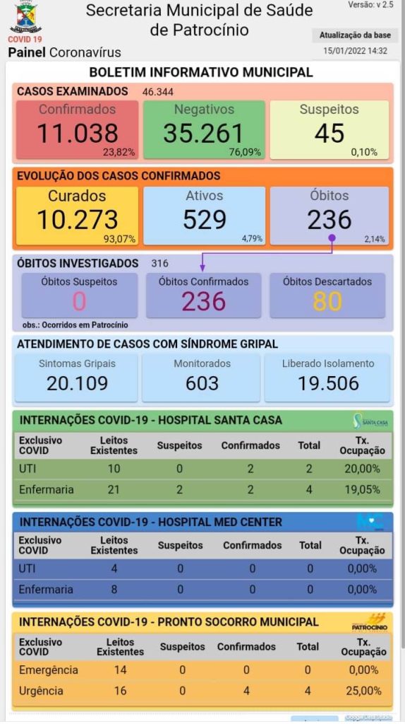 Neste sábado (15) a Secretaria Municipal de Saúde de Patrocínio divulgou o novo boletim epidemiológico de coronavírus.