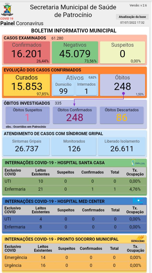 Nesta quinta-feira (07), a Secretaria Municipal de Saúde de Patrocínio divulgou o novo boletim epidemiológico de coronavírus.