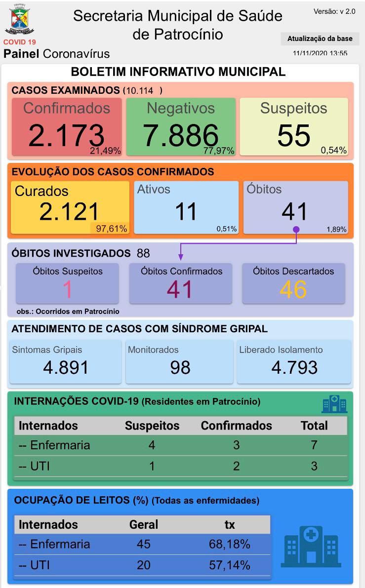 Secretaria Municipal de Saúde de Patrocínio divulgou, nesta quarta-feira (11), o novo boletim epidemiológico de coronavírus.