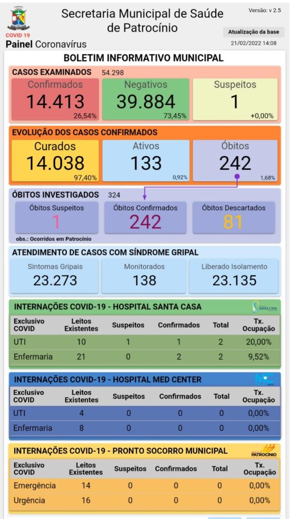 De acordo com os dados há um total de 14.413 casos no município, dentre eles 14.038 curados, 133 ativos e um suspeito.