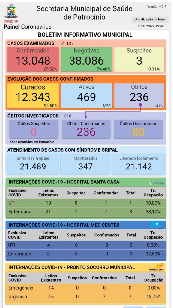Neste domingo (30) a Secretaria Municipal de Saúde de Patrocínio divulgou o novo boletim epidemiológico de coronavírus.