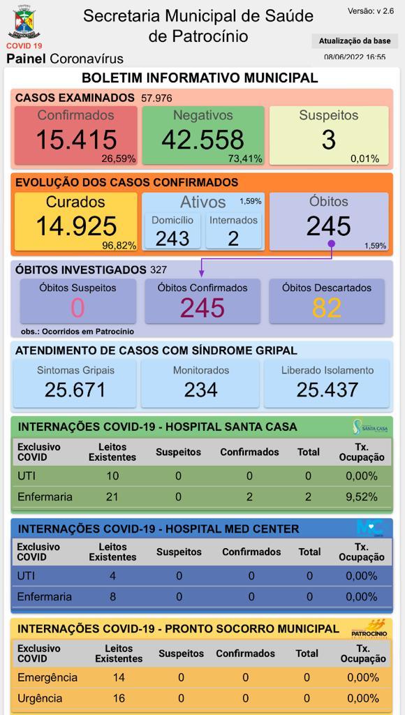 Nesta quarta-feira (08), a Secretaria Municipal de Saúde de Patrocínio divulgou o novo boletim epidemiológico de coronavírus.