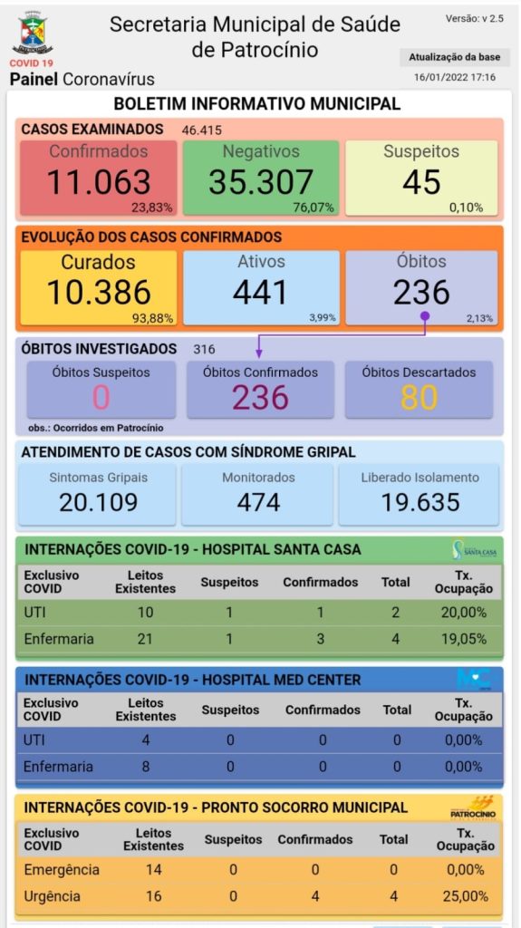 Em relação à ocupação hospitalar de pacientes confirmados e suspeitos de Covid–19 no município, há 10 pacientes internados. No Hospital Santa Casa há dois pacientes na Unidade de Terapia Intensiva (UTI) e quatro na enfermaria. No Hospital Med Center não há paciente internado. No Pronto Socorro há quatro pacientes na urgência.