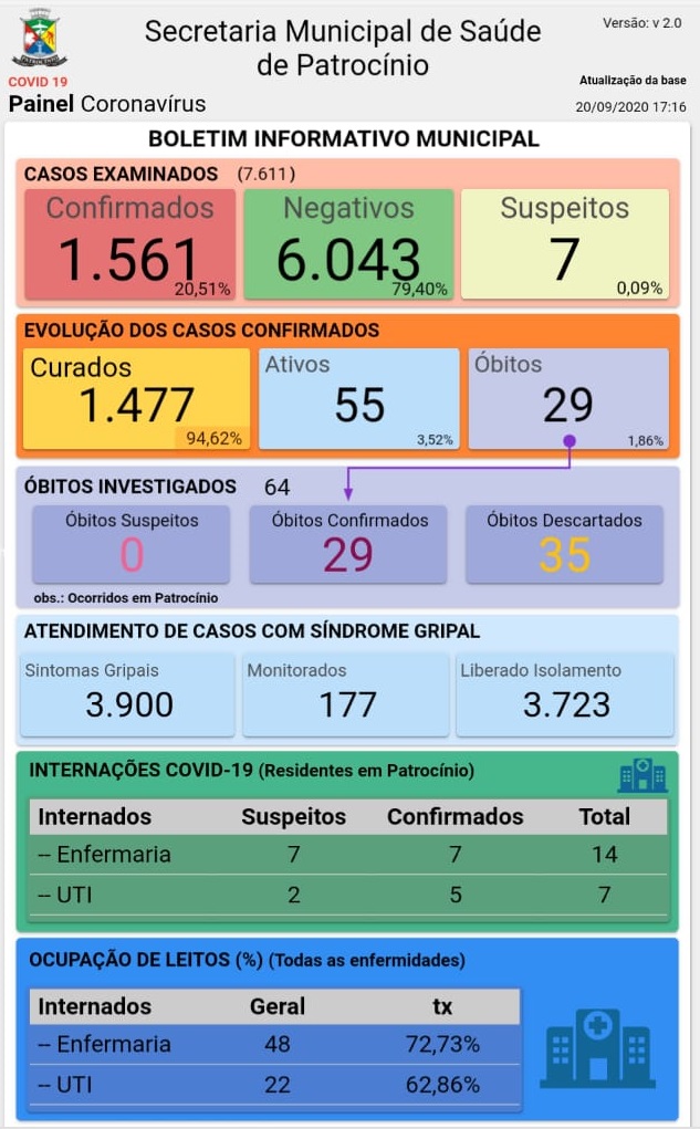No fim da tarde deste domingo (20), a Secretaria Municipal de Saúde de Patrocínio divulgou o novo boletim epidemiológico de coronavírus.