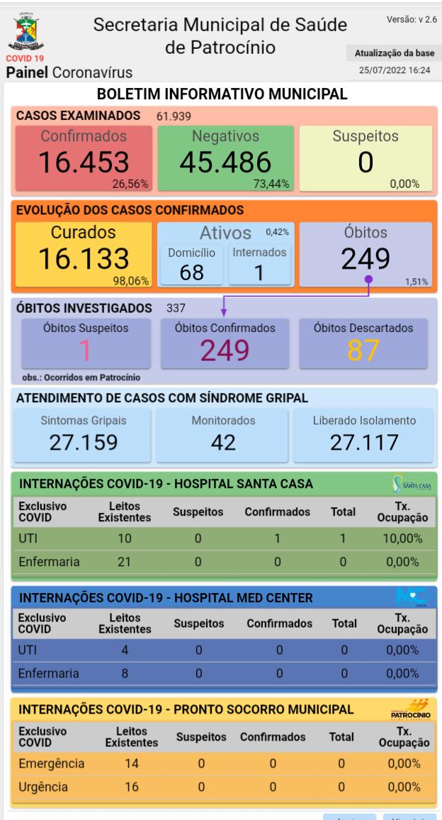 Nesta segunda-feira (25), a Secretaria Municipal de Saúde de Patrocínio divulgou o novo boletim epidemiológico de Coronavírus.