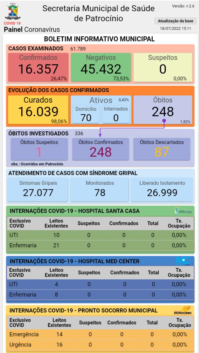 Nesta segunda-feira (18), a Secretaria Municipal de Saúde de Patrocínio divulgou o novo boletim epidemiológico de Coronavírus.