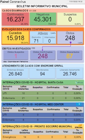 De acordo com os dados há um total de 16.237 casos no município, dentre eles 15.918 curados, 71 ativos e nenhum suspeito.