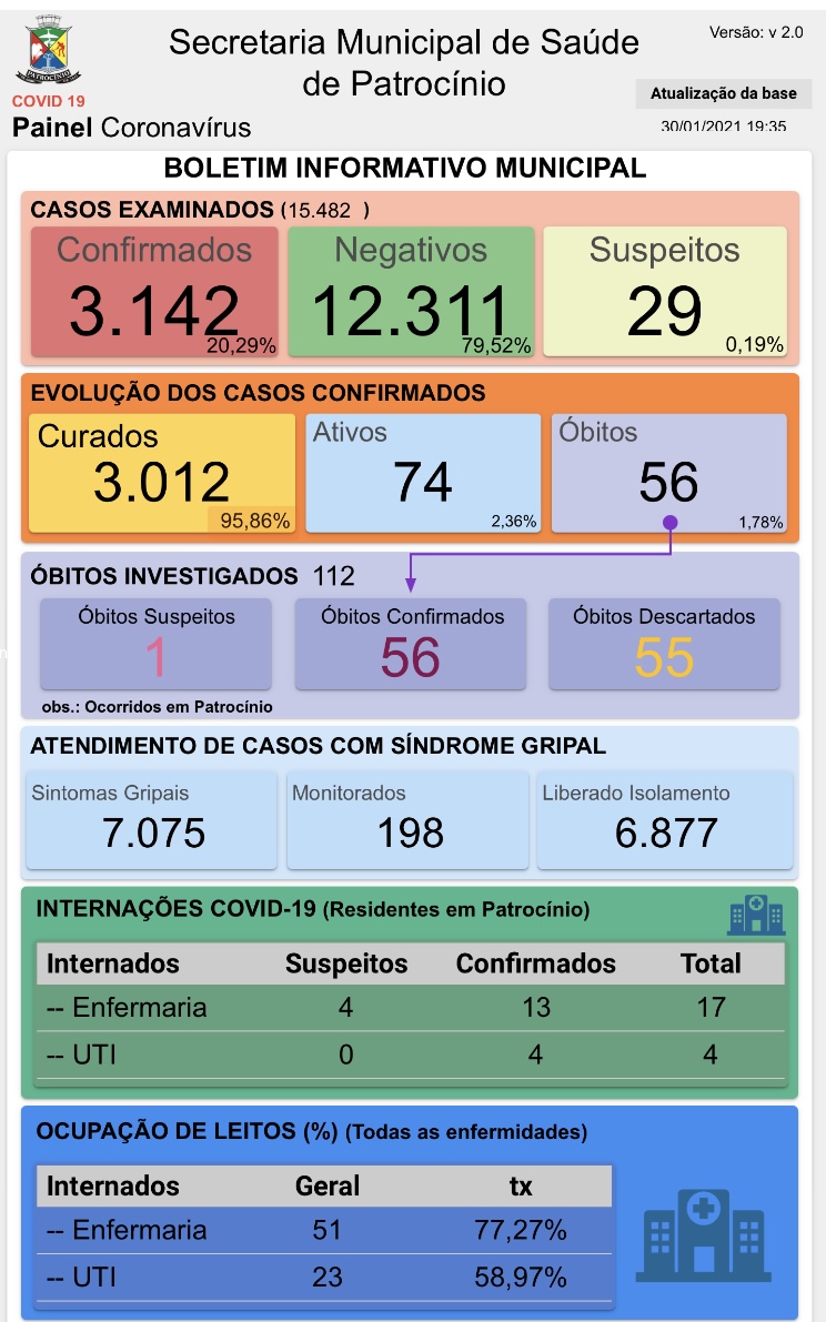 O novo boletim epidemiológico de coronavírus foi divulgado pela Secretaria Municipal de Saúde de Patrocínio na tarde deste sábado (30).