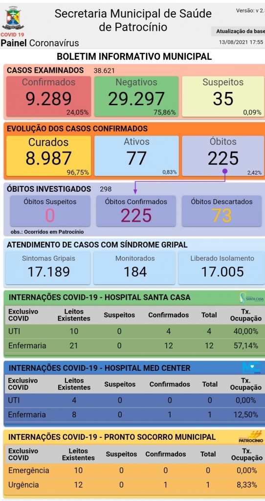 A Secretaria Municipal de Saúde de Patrocínio divulgou nesta sexta-feira (13) o novo boletim epidemiológico de coronavírus.