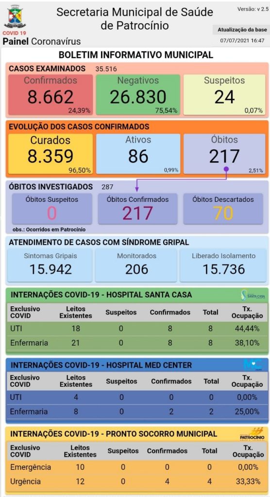 Na tarde desta quarta-feira (07), a Secretaria Municipal de Saúde de Patrocínio divulgou o novo boletim epidemiológico de coronavírus.
