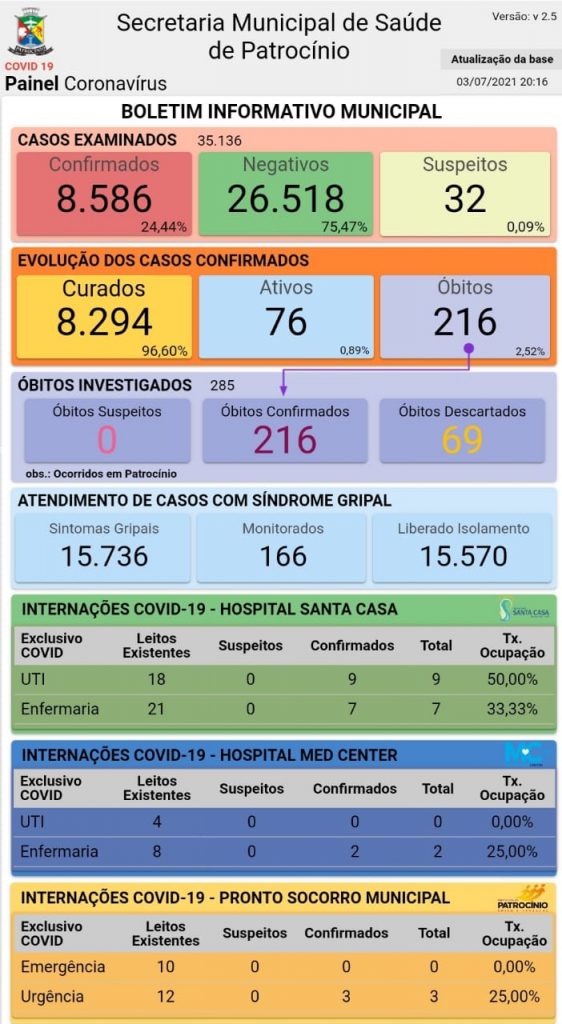Na noite deste sábado (03), a Secretaria Municipal de Saúde de Patrocínio divulgou o novo boletim epidemiológico de coronavírus.