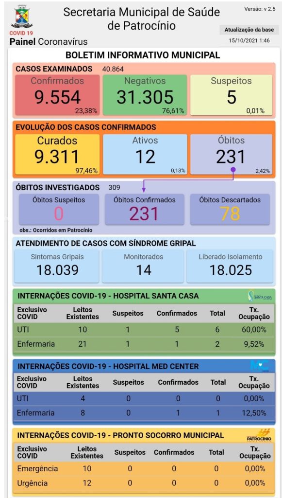 Nesta sexta-feira (15) a Secretaria Municipal de Saúde de Patrocínio divulgou o novo boletim epidemiológico de coronavírus.