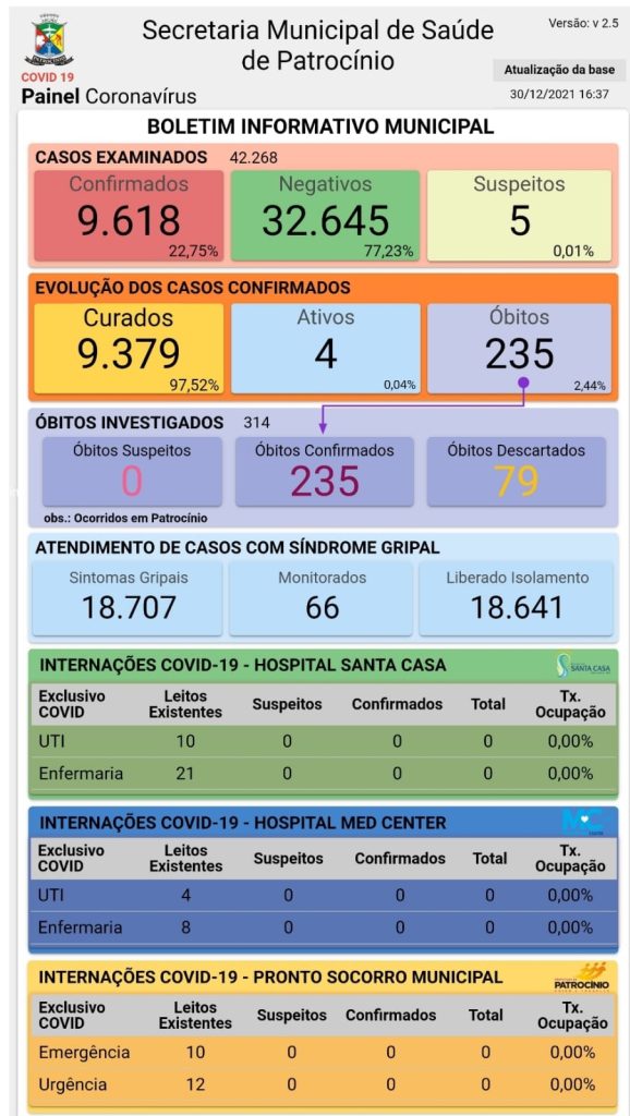 A Secretaria Municipal de Saúde de Patrocínio divulgou na última quinta-feira (30) o novo boletim epidemiológico de coronavírus.