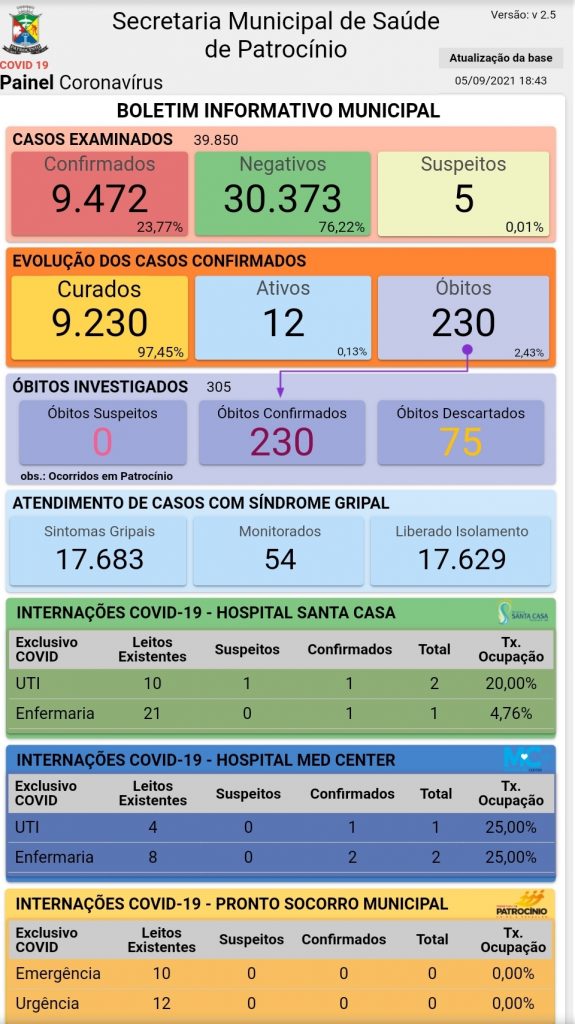 A Secretaria Municipal de Saúde de Patrocínio divulgou neste domingo (05) o novo boletim epidemiológico de coronavírus.