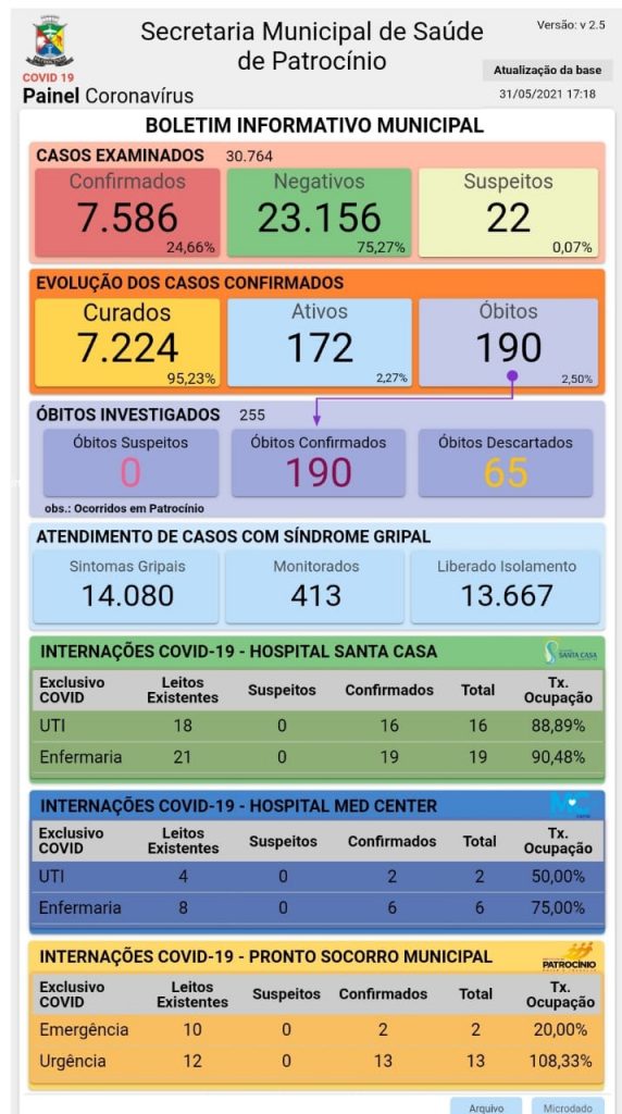 Na tarde desta segunda-feira (31), a Secretaria Municipal de Saúde de Patrocínio divulgou o novo boletim epidemiológico de coronavírus.
