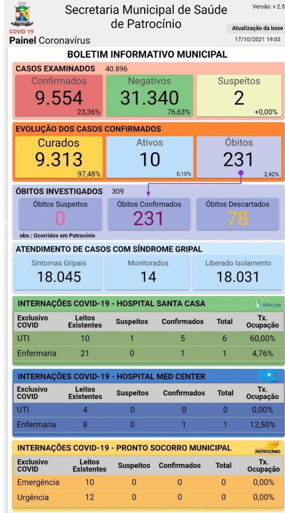 Neste domingo (17) a Secretaria Municipal de Saúde de Patrocínio divulgou o novo boletim epidemiológico de coronavírus.