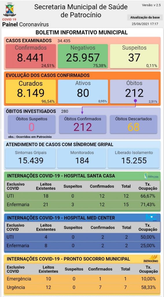 Na tarde desta sexta-feira (25), a Secretaria Municipal de Saúde de Patrocínio divulgou o novo boletim epidemiológico de coronavírus.