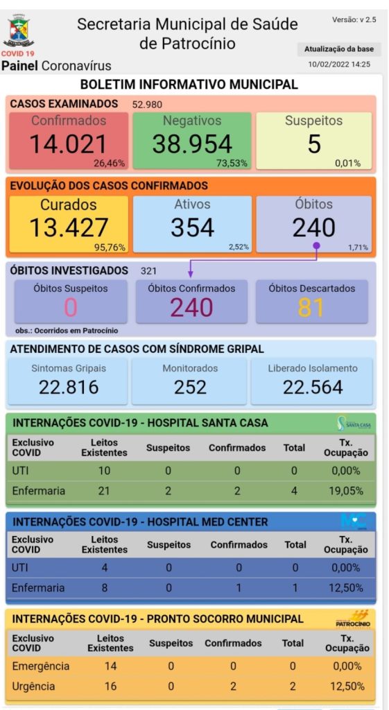 De acordo com os dados há um total de 14.021 casos no município, dentre eles 13.427 curados, 354 ativos e cinco suspeitos.