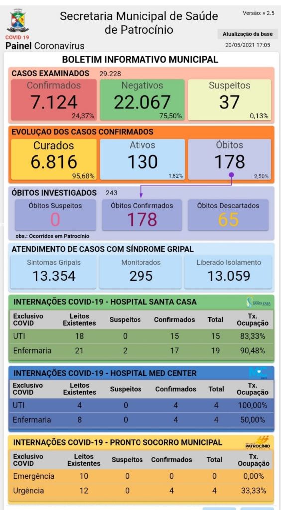 A Secretaria Municipal de Saúde de Patrocínio divulgou, nesta quinta-feira (20), o novo boletim epidemiológico de coronavírus.