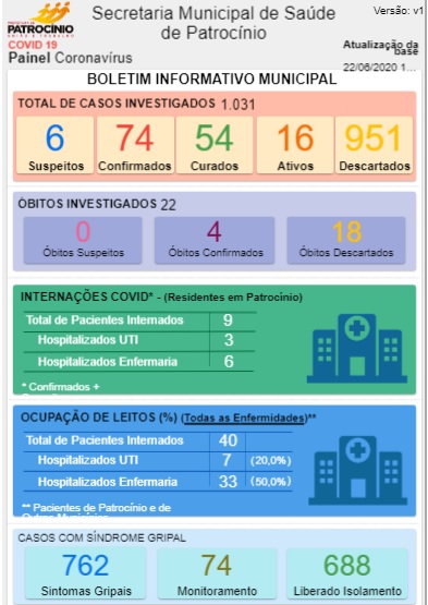 A Secretaria de Saúde de Patrocínio divulgou na manhã desta segunda-feira (22) a atualização do boletim epidemiológico de coronavírus no município.