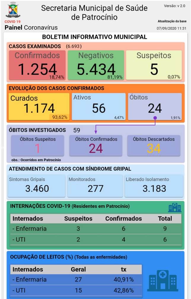 Em Patrocínio já são 1.254 pacientes infectados pelo vírus, dos quais 1.174 estão curados, 56 com o vírus ativo e 24 foram a óbito.
