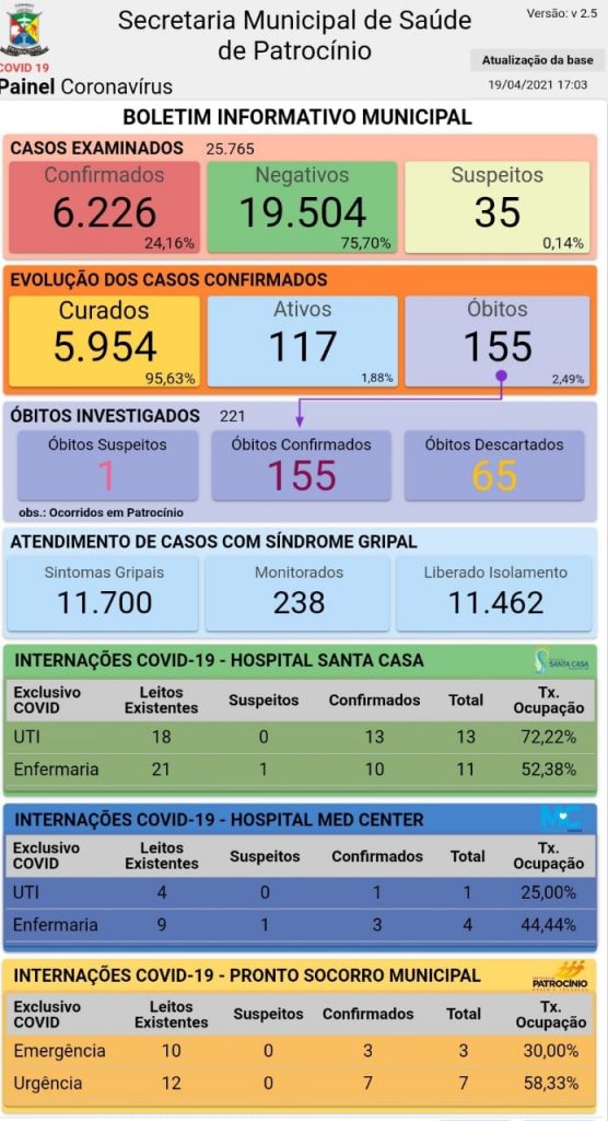 Na tarde desta segunda-feira (19), a Secretaria Municipal de Saúde de Patrocínio divulgou o novo boletim epidemiológico de coronavírus.