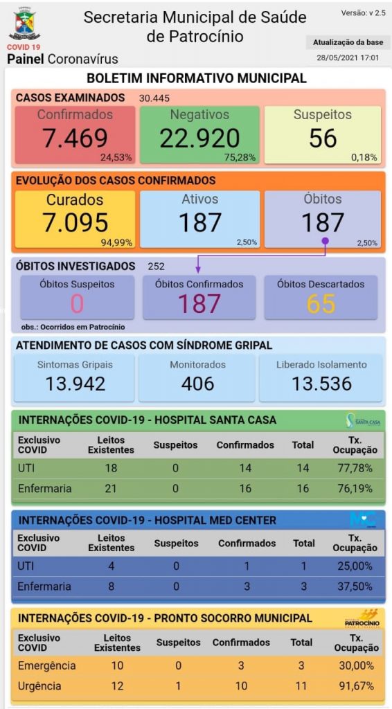 A Secretaria Municipal de Saúde de Patrocínio divulgou, na tarde desta sexta-feira (28), o novo boletim epidemiológico de coronavírus.