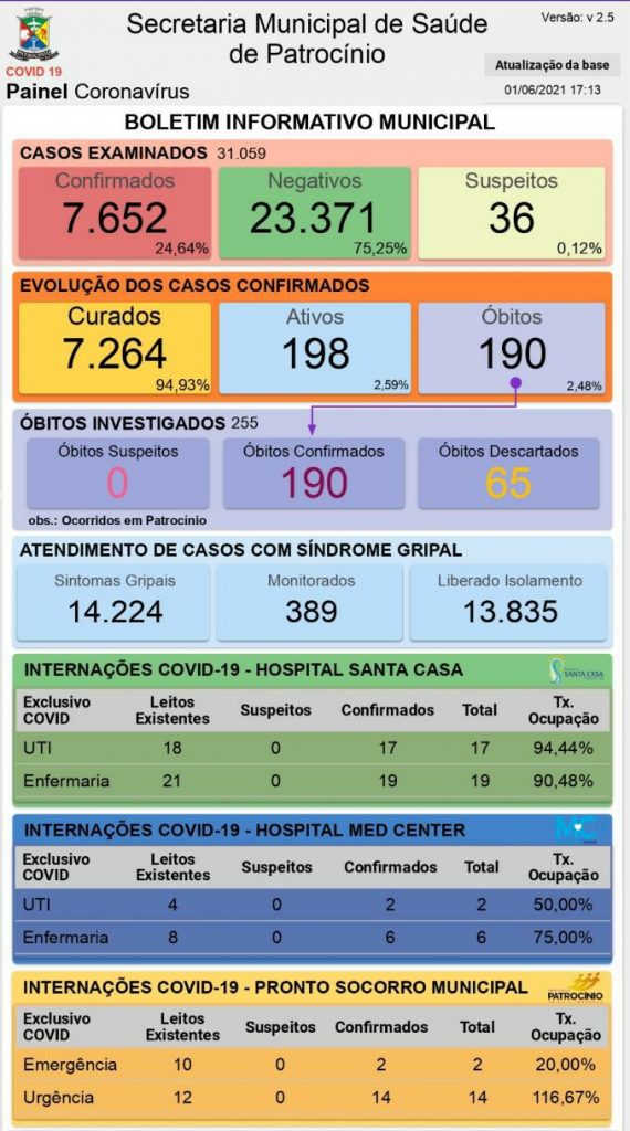 A Secretaria Municipal de Saúde de Patrocínio divulgou, na tarde desta terça-feira (1), o novo boletim epidemiológico de coronavírus.