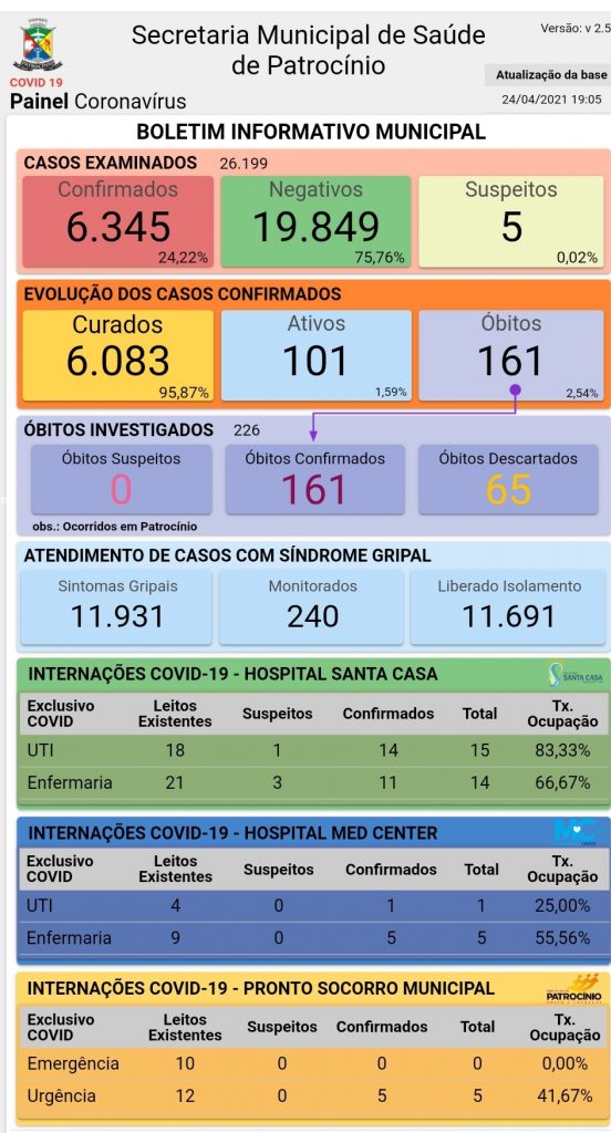 A Secretaria Municipal de Saúde de Patrocínio divulgou, neste sábado (24), o novo boletim epidemiológico de coronavírus.