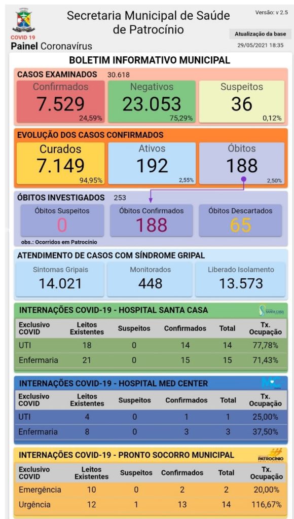 Em relação à ocupação hospitalar de pacientes confirmados e suspeitos de Covid–19 no município, há um total de 49 pacientes internados. Na Santa Casa, 29 pacientes, sendo 15 em leitos de enfermaria e 14 na Unidade de Terapia Intensiva (UTI). No Med Center são quatro pacientes, sendo um na Unidade de Terapia Intensiva (UTI) e três na enfermaria. No Pronto Socorro há 16 pacientes, sendo dois na emergência e 14 na urgência.
