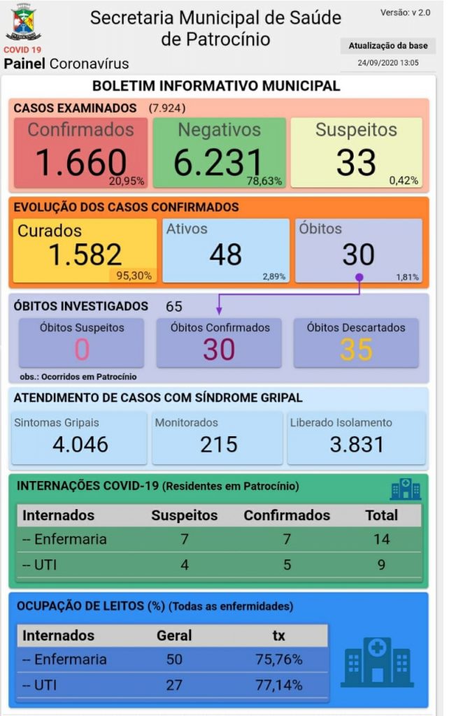 A Secretaria Municipal de Saúde de Patrocínio divulgou, nesta quinta-feira (24), o novo boletim epidemiológico de coronavírus, o qual apresentou um aumento de 32 casos confirmados da Covid-19 no município.