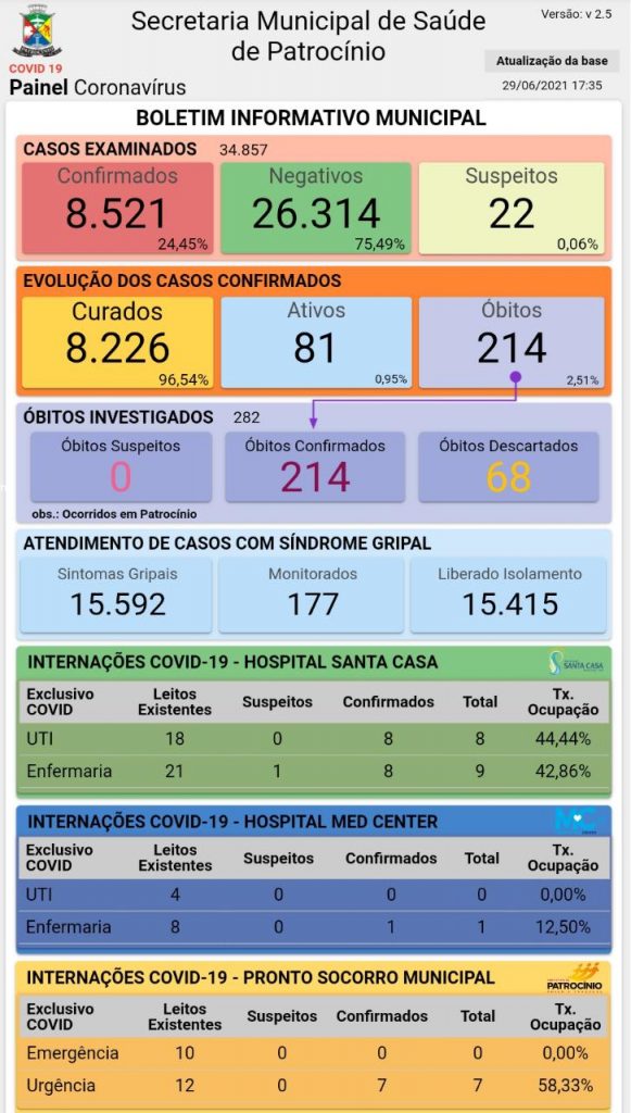 A Secretaria Municipal de Saúde de Patrocínio divulgou, na tarde desta terça-feira (29), o novo boletim epidemiológico de coronavírus.