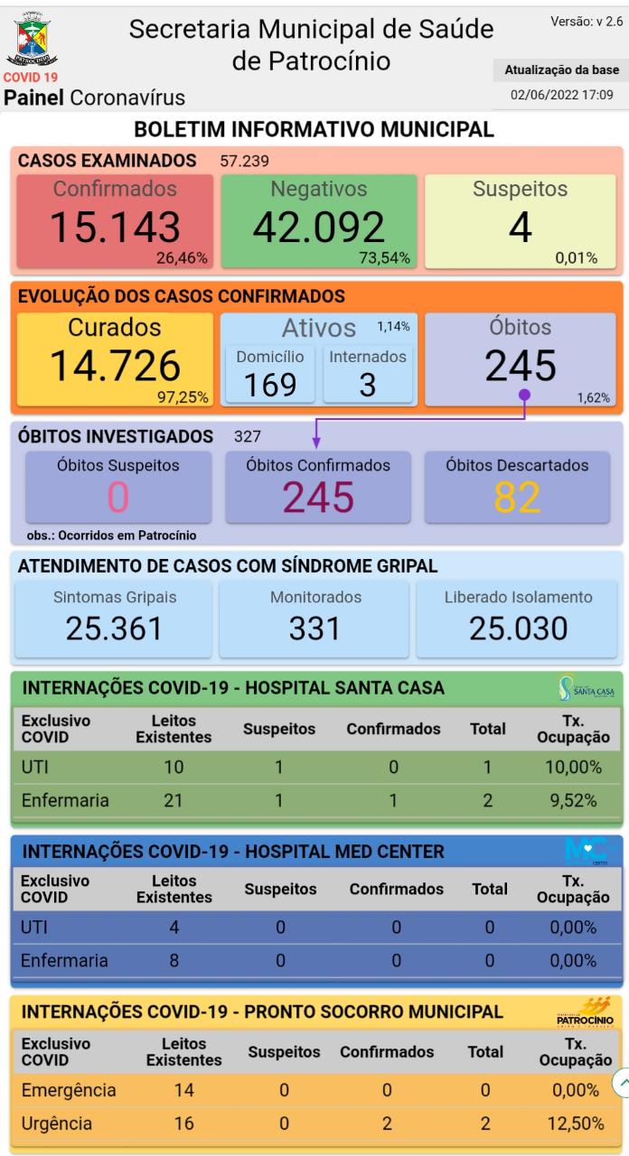 Nesta quinta-feira (02), a Secretaria Municipal de Saúde de Patrocínio divulgou o novo boletim epidemiológico de coronavírus.